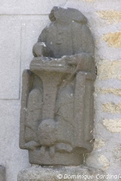 La VIERGE A L’ ENFANT de l’église du Grouanec, dans une niche basse qui devait servir autrefois de bénitier… Jusqu’à la restauration de cette église, la statue se trouvait à Kerriec, sur le socle de la croix n° 62. Elle s’encastre dans l’évidement d’un chapiteau circulaire à moulures, et elle porte 2 écus : d’un côté, un calice et les lettres « N D » ; de l’autre, les instruments de la Passion.