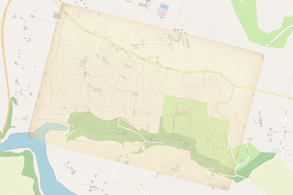 Ci-dessous le cadastre de 1841 en transparence sur la carte actuelle de la vallée des moulins, en zoomant vous pouvez distinguer les emplacements de moulins de Rannorgad, Bload, Kerverg et Kervili.
