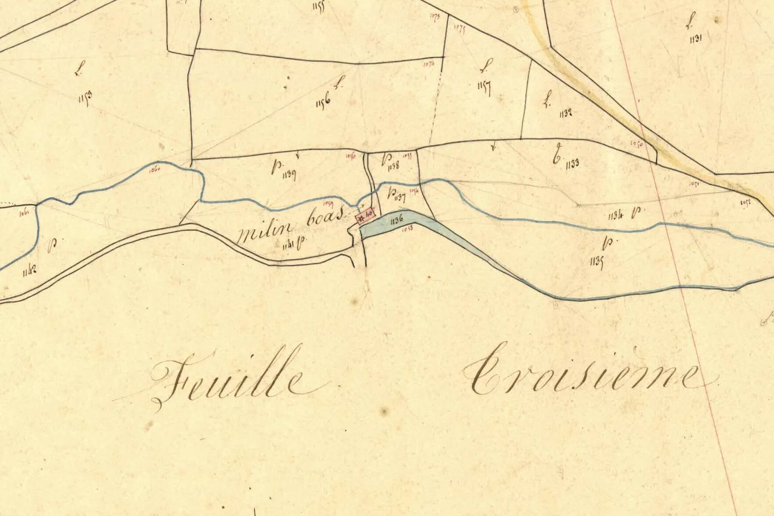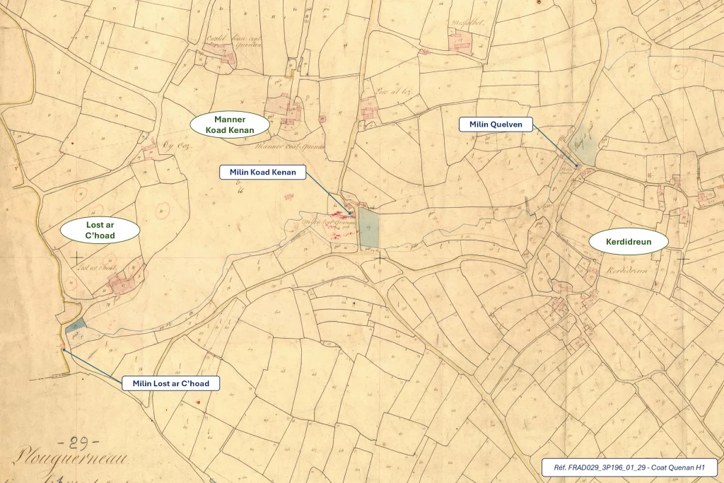 - Milin Lost ar C’hoad (n’est pas identifié sur le cadastre, mais l’étang caractéristique et le bâtiment sont indiqués)